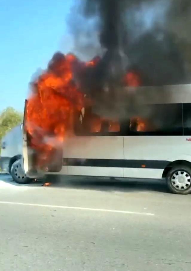 Minibüsün ön kısmından yükselen dumanların ardından araç bir anda alev topuna döndü. 3 şeritli yol kontrol amaçlı tek şeride indirilirken, yaşanan korku dolu anlar vatandaşların cep telefonu kamerasına yansıdı.