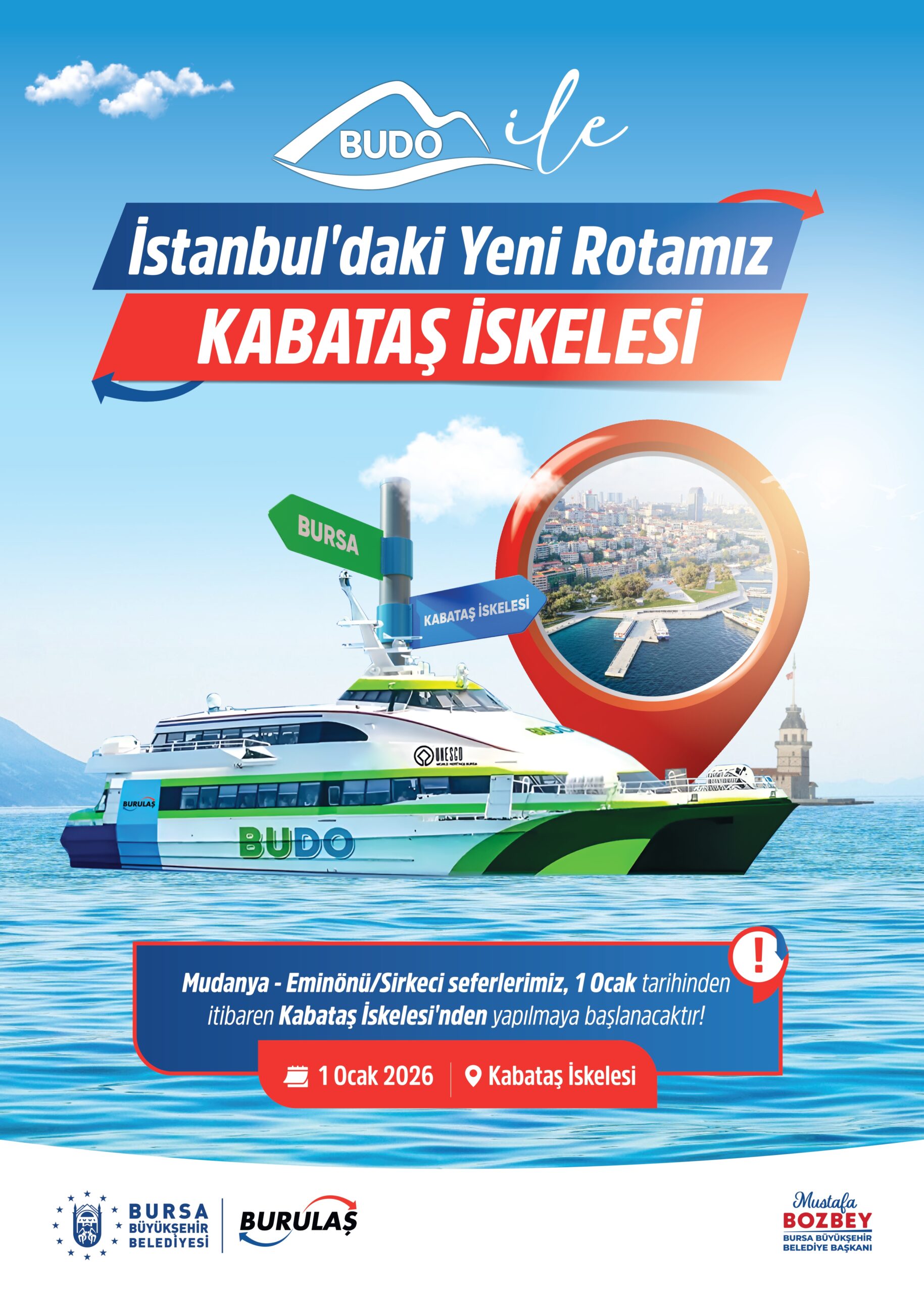 BURSA – Bursa Büyükşehir Belediyesi iştiraklerinden BURULAŞ tarafından işletilen Bursa Deniz Otobüsleri (BUDO) İstanbul seferlerinin varış noktası, 1 Ocak 2026 tarihinden itibaren Kabataş Transfer Merkezi olacak.